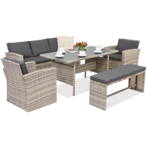 Diese Gartenmöbel sind beständig gegen UV-Strahlung, Regen und Hagel. Sie sind problemlos zu pflegen und erfordern keine zusätzliche Wartung. Deshalb ist das widerstandsfähige Technorattan eine hervorragende Alternative zu natürlichen Materialien. Außerdem sind es sehr bequeme Möbel. Denn Technorattan fühlt sich angenehm an und kann wie ein natürliches Geflecht profiliert werden. Was die Verwendung anderer Materialien betrifft, so befindet sich unter der Technorattanschicht meist ein Aluminium- oder Stahlrahmen, während die Tischplatten oft mit Schutzglas versehen sind.